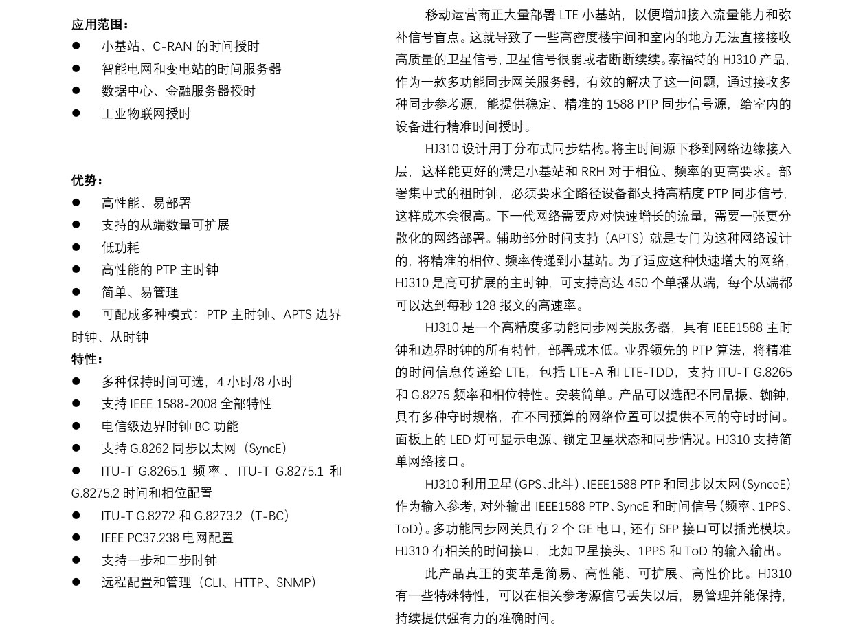HJ310設(shè)計(jì)用于分布式同步結(jié)構(gòu)。將主時(shí)間源下移到網(wǎng)絡(luò)邊緣接入層,這樣能更好的滿足小基站和RRH對于相位、頻率的更高要求。部署集中式的祖時(shí)鐘,必須要求全路徑設(shè)備都支持高精度PTP同步信號,這樣成本會很高。下一代網(wǎng)絡(luò)需要應(yīng)對快速增長的流量,需要一張更分散化的網(wǎng)絡(luò)部署。...